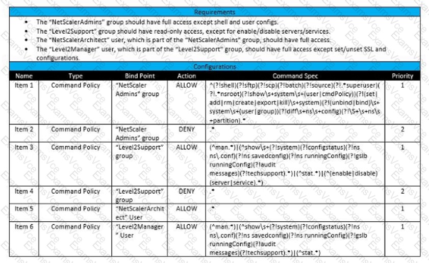 Scenario: A Citrix Architect needs to assess an existing Citrix ADC configuration. The customer recently found that members of certain administrator groups were receiving permissions on the production Citrix ADC appliances that do NOT align with the designed security requirements. Click the Exhibit button to view the configured command policies for the production Citrix ADC deployment.