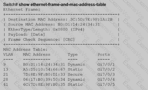 Aswitch receives a frame with the destination MAC address 3C:5D: 7E:9F: 1A:2B.
