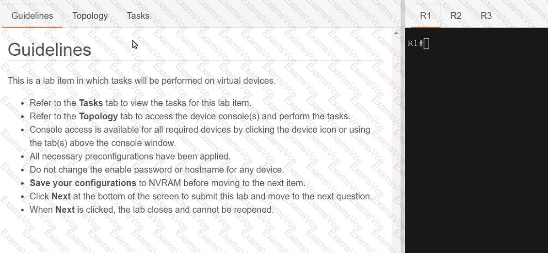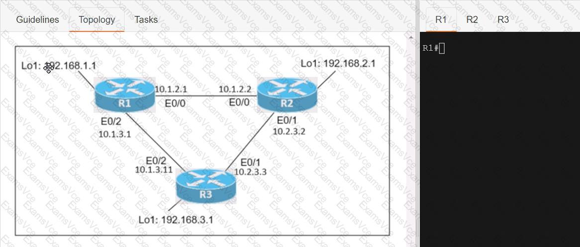 1. All traffic sent from R3 to the R1 Loopback address must be configured for NAT on R2. All source addresses must be translated from R3 to the IP address of Ethernet0/0 on R2, while using only a standard access list named NAT To verify, a ping must be successful to the R1 Loopback address sourced from R3. Do not use NVI NAT configuration.