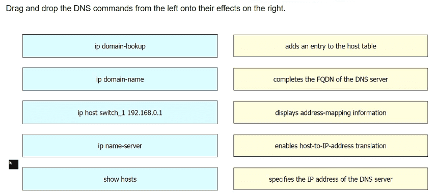 Drag and drop the DNS commands from the left onto their effects on the right.