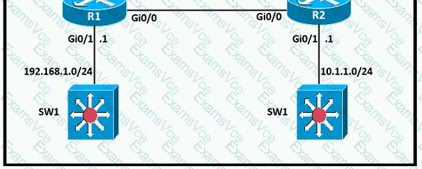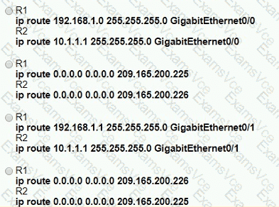 A network engineer is in the process of establishing IP connectivity between two sites. Routers R1 and R2 are partially configured with IP addressing. Both routers have the ability to access devices on their respective LANs. Which command set configures the IP connectivity between devices located on both LANs in each site?