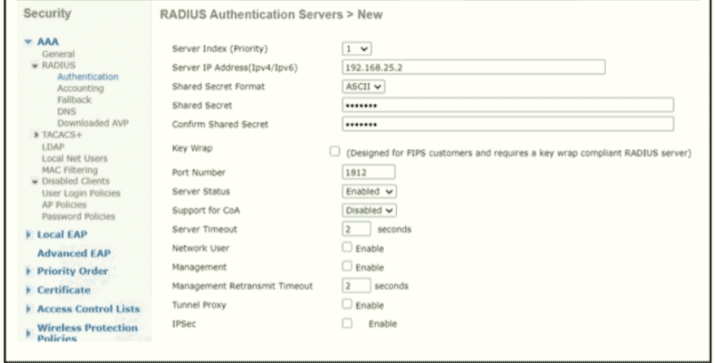 A network engineer configures the Cisco WLC to authenticate local wireless clients against a RADIUS server Which task must be performed to complete the process?