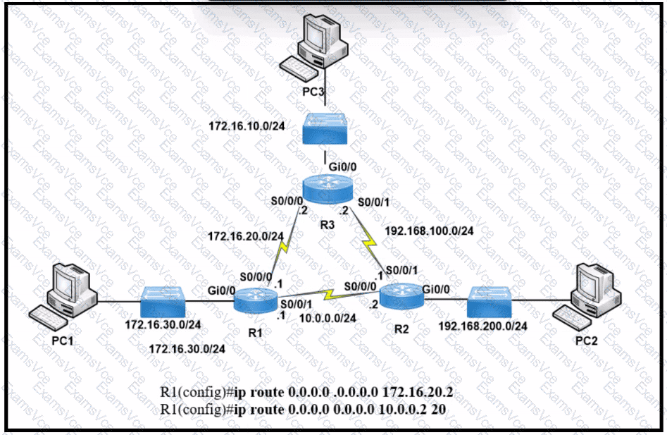 Refer to the exhibit. After applying this configuration to router R1, a network engineer is verifying the implementation. If all links are operating normally, and the engineer sends a series of packets from PC1 to PC3. how are the packets routed?