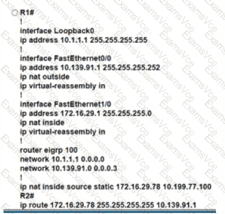 Refer to the exhibit. An engineer must translate the PC1 IP address to 10.199.77.100 and permit PC1 to ping the loopback 0 on router R2. What command set must be used?
