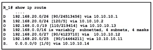 Packets are flowing from 192.168.10.1 to the destination at IP address 192.168.20.75. Which next hop will the router select for the packet?