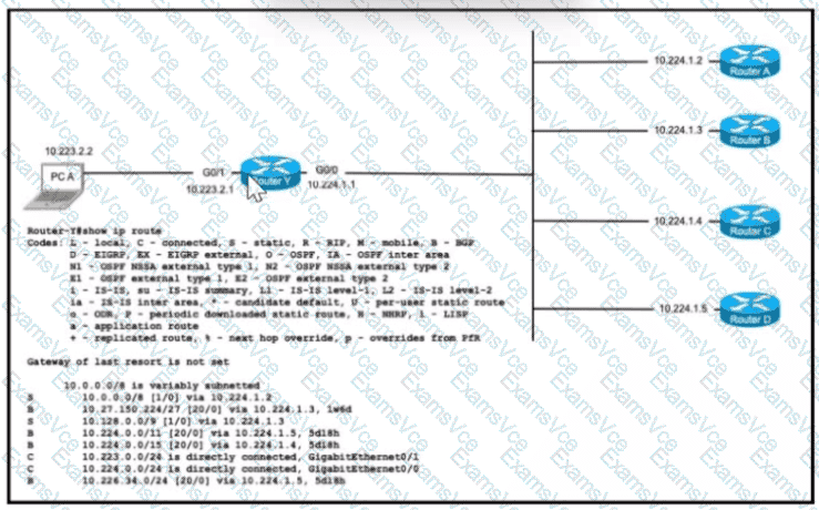 PC A is communicating with another device at IP address 10.227.225.255. Through which router does router Y route the traffic?