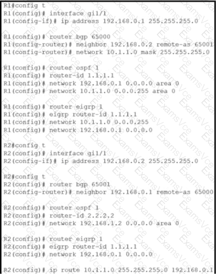 Router R2 is configured with multiple routes to reach network 10 1.1 0/24 from router R1. What protocol is chosen by router R2 to reach the destination network 10.1 1 0/24?