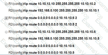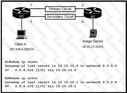 Refer to the exhibit Routers R1 and R2 have been configured with their respective LAN interfaces The two circuits are operational and reachable across WAN Which command set establishes failover redundancy if the primary circuit goes down?