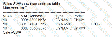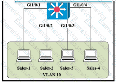 The entire contents of the MAC address table are shown. Sales-4 sends a data frame to Sales-1.