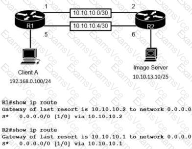 The image server and client A are running an application that transfers an extremely high volume of data between the two. An engineer is configuring a dedicated circuit between R1 and R2. Which set of commands must the engineer apply to the routers so that only traffic between the image server and client A is forces to use the new circuit?
