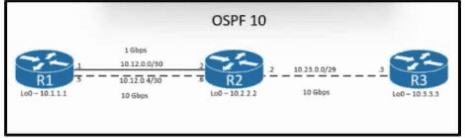 Refer to the exhibit. The loopback IP of R3 has been learned via the two interfaces on R1. R1 is configured with a reference bandwidth of 10 Gbps. Based on the metric calculations, which next hop IP would be used for outgoing routing?