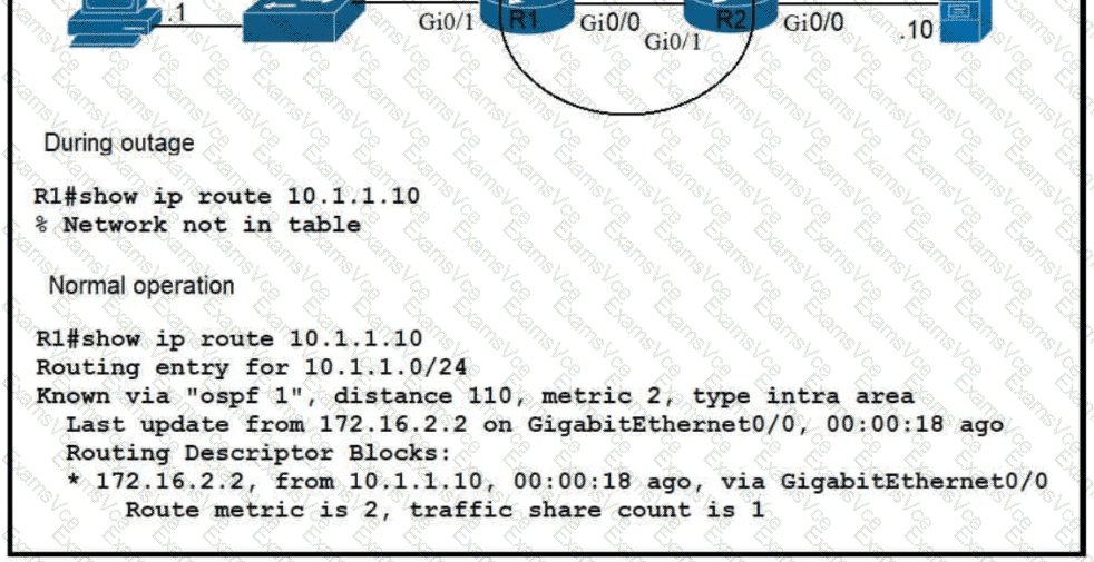 Which route must be configured on R1 so that OSPF routing is used when OSPF is up. but the server is still reachable when OSPF goes down?
