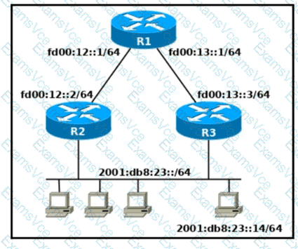 Refer to the exhibit. Which two commands, when configured on router R1. fulfill these requirements? (Choose two.) ' Packets toward the entire network 2001:db8:23: :/64 must be forwarded through router R2. ' Packets toward host 2001: db8:23::14 preferably must be forwarded through R3.