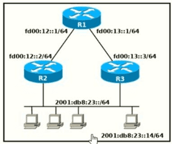 Packets toward host 2001:db8:23::14 preferably must be forwarded through R3.