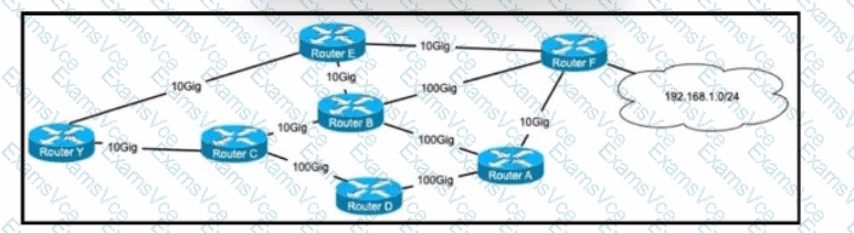Refer to the exhibit. With a reference bandwidth of 100 Gb on all routers, which path does router Y use to get to network 192.168.1.0/24?