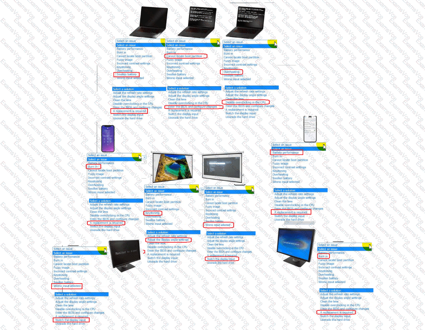 Click on each device to review the issue. Then select the appropriate issue and solution