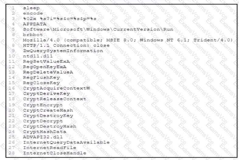 The correct answer isFiles are encrypted. The exhibit shows a collection of API calls and strings that strongly indicatecryptographic operations associated with file encryption, a common behavior in ransomware and data-encrypting malware.