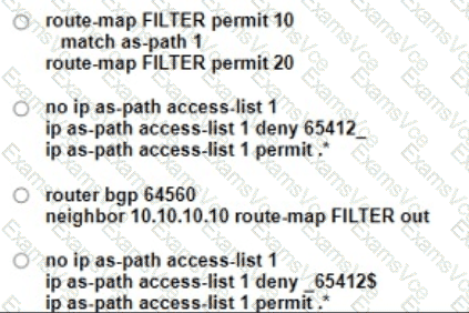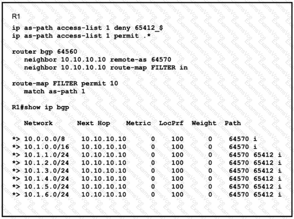 Refer to the exhibit. An engineer must filter prefixes that originate from AS65412. but it is not working correctty. Which configuration must the engineer apply to R1 to resolve the issue?