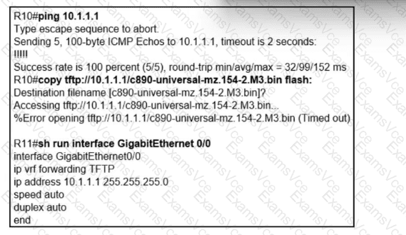 Refer to the exhibit. R10 attempts to copy an image file from R11 using TFTP, and the operation is timing out. Which action resolves the issue?