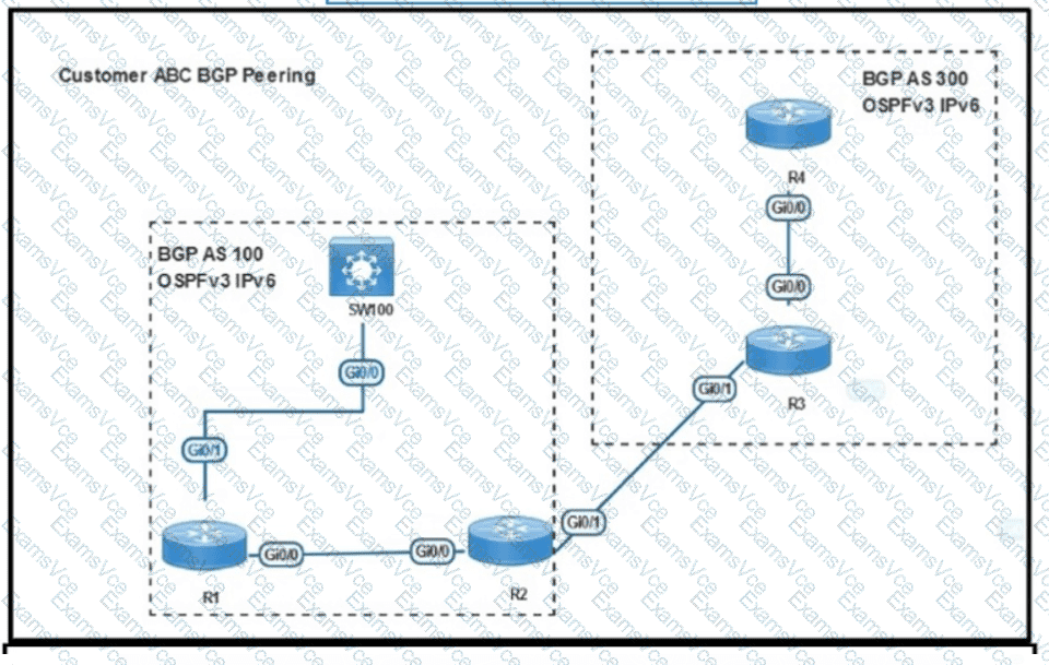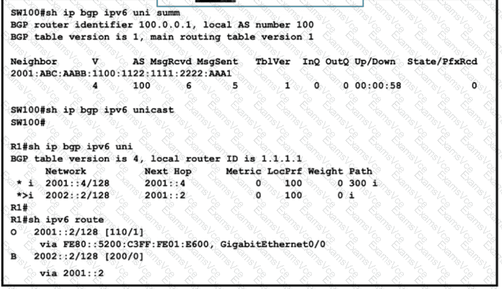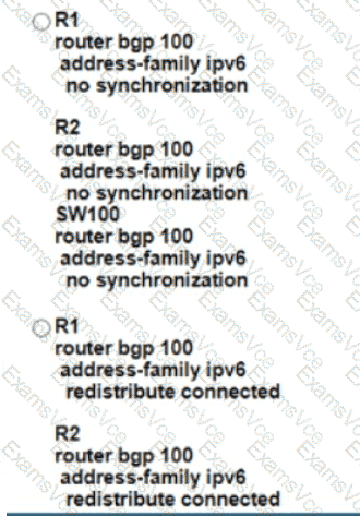 Refer to the exhibit SW100 cannot receive routes from R1 Which configuration resolves the issue?