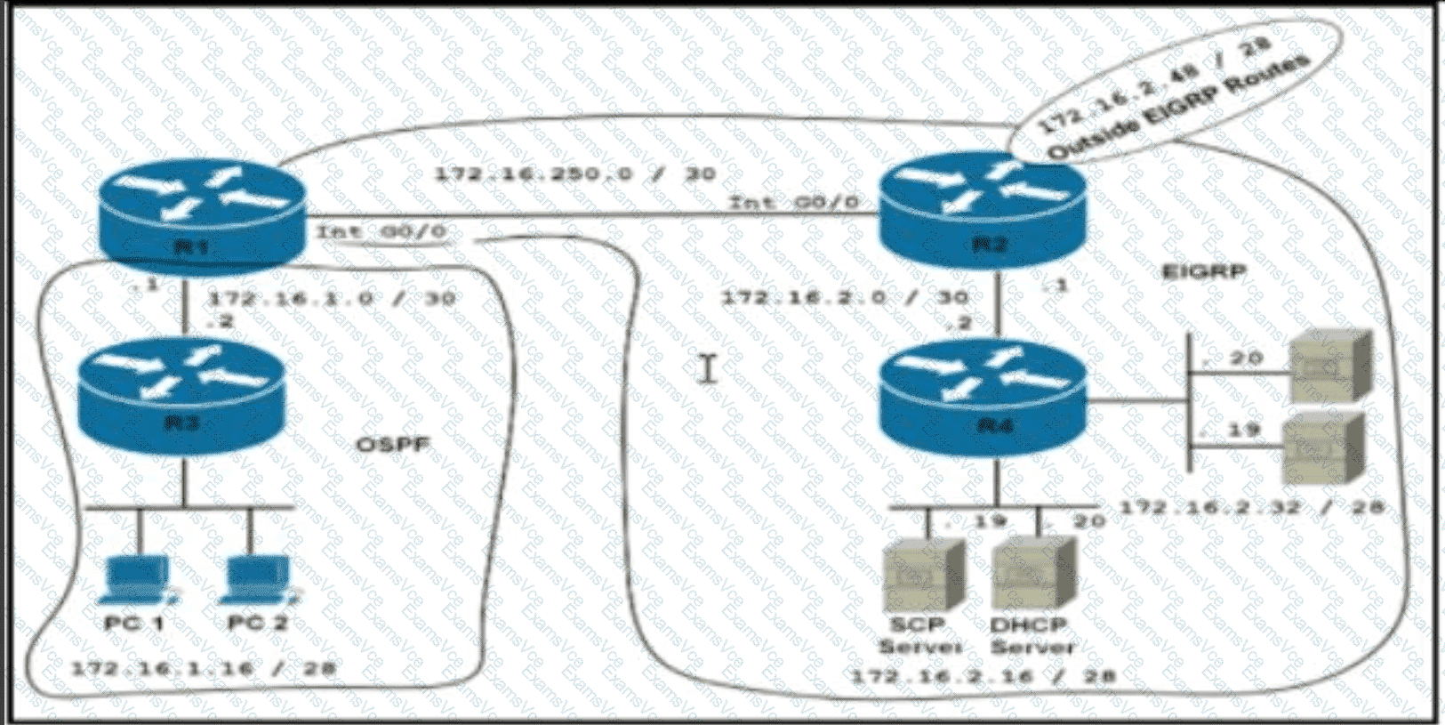 Refer to the exhibit. Which configuration resolves the route filtering issue on R1 to redistribute all the routes except 172.16.2.48/28?