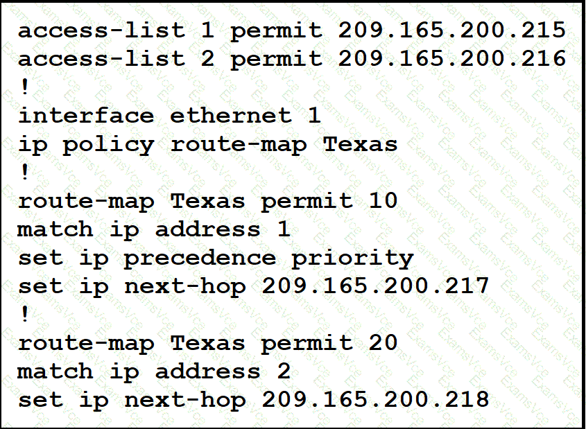 Packets arriving from source 209.165.200.215 must be sent with the precedence bit set to 1, and packets arriving from source 209.165.200.216 must be sent with the precedence bit set to 5. Which action resolves the issue?