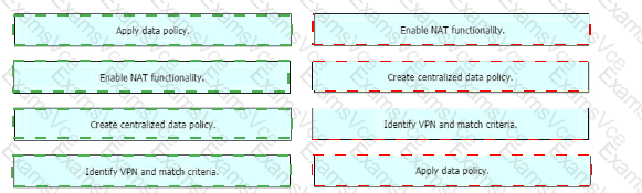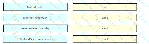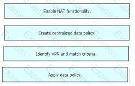 Drag and drop the actions from the left into the correct sequence on the right to create a data policy to direct traffic to the Internet exit.