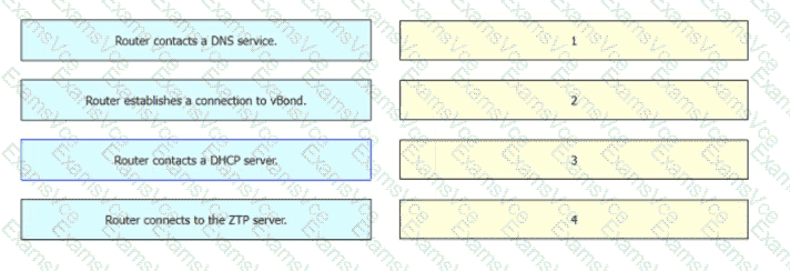 Drag and drop the steps from the left into the sequence on the right for a WAN Edge router after powering on for zero touch provisioning.