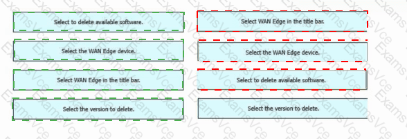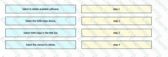 Drag and drop the steps from the left into the order on the right to delete a software image for a WAN Edge router starting with Maintenance > Software Upgrade > Device list on vManage.