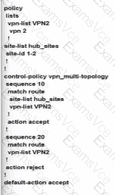 Which control policy assigned to Drenches in the out direction establishes a strict hub-and-spoke topology tor VPN2?