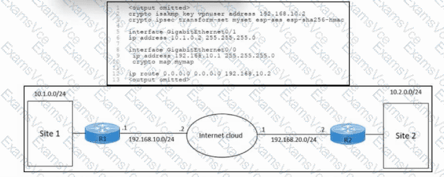 Refer to the exhibit. An engineer must configure an IPsec VPN connection between site 1 and site 2. The indicated configuration was applied to router R1; however, the tunnel fails to come up. Which command must be run on R1 to resolve the issue?