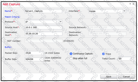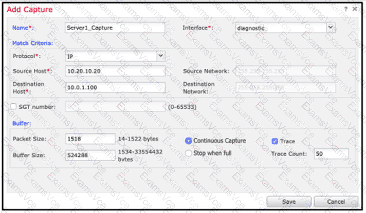 An engineer is troubleshooting a device that cannot connect to a web server. The connection is initiated from the Cisco FTD inside interface and attempting to reach 10.0.1.100 over the non-standard port of 9443 The host the engineer is attempting the connection from is at the IP address of 10.20.10.20. In order to determine what is happening to the packets on the network, the engineer decides to use the FTD packet capture tool Which capture configuration should be used to gather the information needed to troubleshoot this issue?