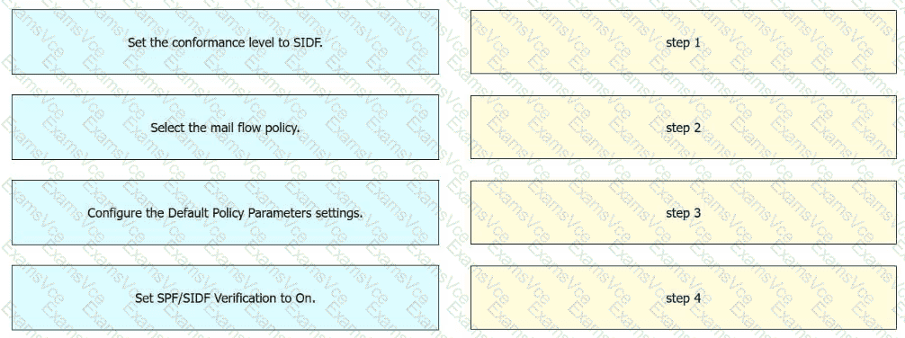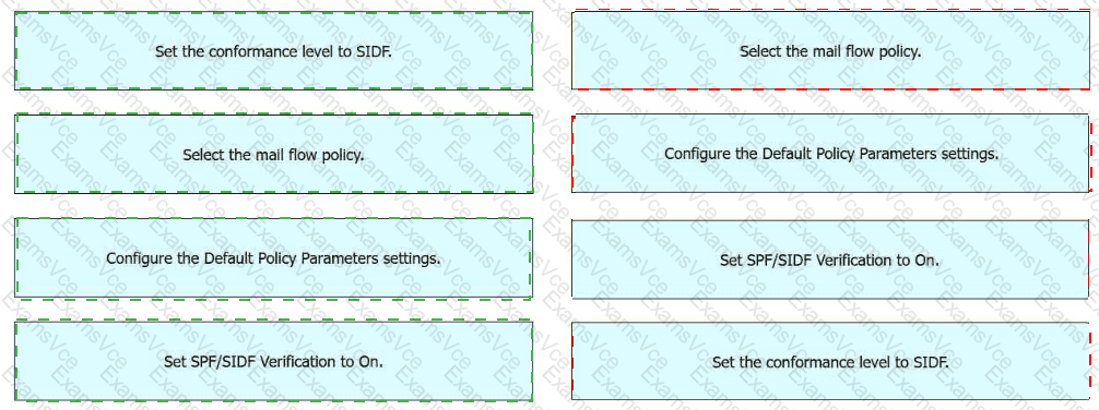 An engineer must enable SIDF for a mail flow policy on an incoming listener in Cisco Secure Email Gateway. Drag and drop the actions from the left into the sequence on the right to meet the requirement.