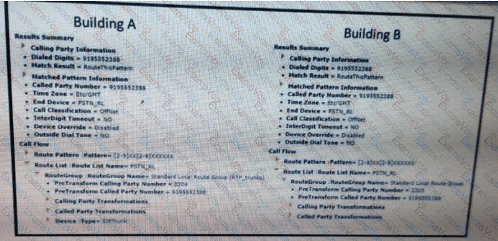 Refer to the exhibit. A standard local route group is configured for long-distance calls. Calls from building A succeed, but calls from building B fail. On the system. Each building has is own device pool. The DNA tool is used to test the configuration. How is this issue resolved?