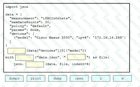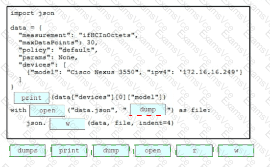Drag and drop the code snippets from the bottom onto the blanks in the Python script to print the device model to the screen and write JSON data to a file. Not all options are used