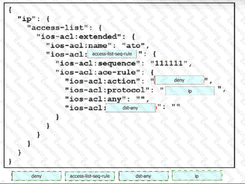 Drag and drop the code snippets from the bottom onto the blanks in the code to construct a request that configures a deny rule on an access list?