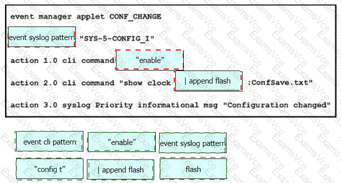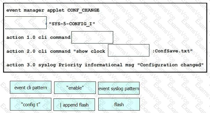 Drag and drop the snippets onto the blanks within the code to create an EEM script that adds an entry to a locally stored text file with a timestamp when a configuration change is made. Not all options are used.