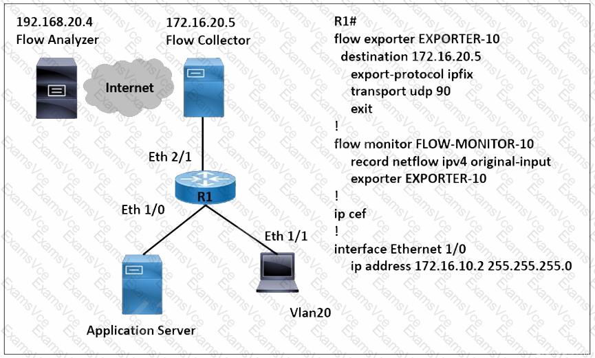 Refer to the exhibit. A network engineer wants to monitor traffic from the application server and send the output to the external monitoring device at 172.16.20.5. Application server traffic should pass through the R1 Eth2/1 interface for further analysis after it is monitored. Which configuration must be applied on the R1 router?