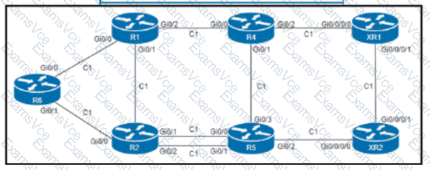 Refer to the exhibit. An engineer configured R6 as the headend LSR of an RSVP-TE LSP to router XR2, with the dynamic path signaled as R6-R2-R5-XR2. and set the OSPF cost of all links to 1. MPLS autotunnel backup Is enabled on all routers to protect the LSP. Which two NNHOP backup tunnels should the engineer use to complete the implementation? (Choose two.)