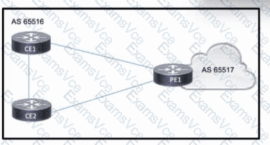 Refer to the exhibit. CE1 and CE2 reside in AS 65516 and access the internet through PE1, which resides in AS 65517. The PE-CE routing protocol is BGP, and CE1 and CE2 have an established iBGP peering. A network engineer must implement a route map on CE1 so that it becomes the preferred entry point for traffic from PE1.