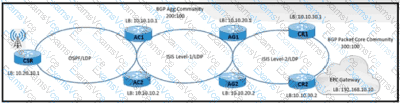 A NOC engineer is configuring label-based forwarding from CSR to the EPC gateway. Cell-site operation and maintenance for IPv4 traffic between 10.20.10.1 and 192.168.10.10 is already up. CR1 and CR2 are configured as route reflectors for AG1 and AG2. Which action completes the configuration?