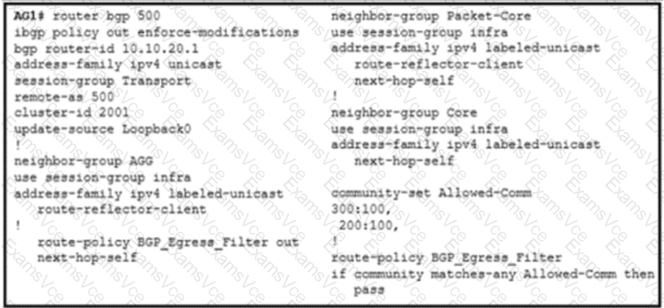 Configure AG1 to allow the 300:100 and 200:100 communities in the BGP_Egress_Filter route policy.