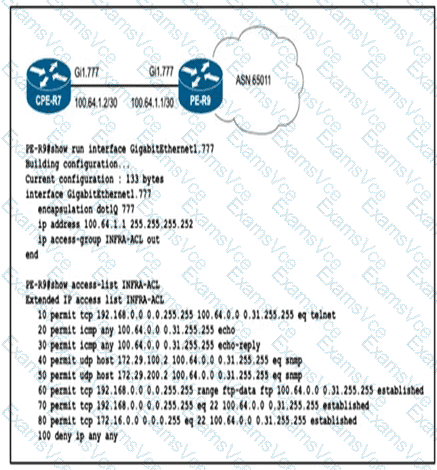To protect in-band management access to CPE-R7, an engineer wants to allow only SSH management and provisioning traffic from management network 192.168.0.0/16. Which infrastructure ACL change must be applied to router PE-R9 to complete this task?