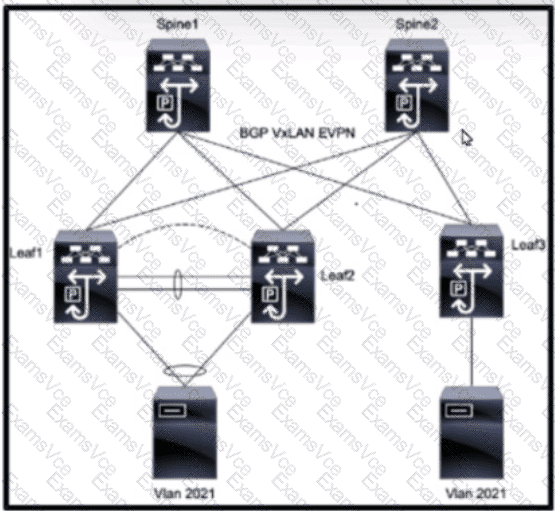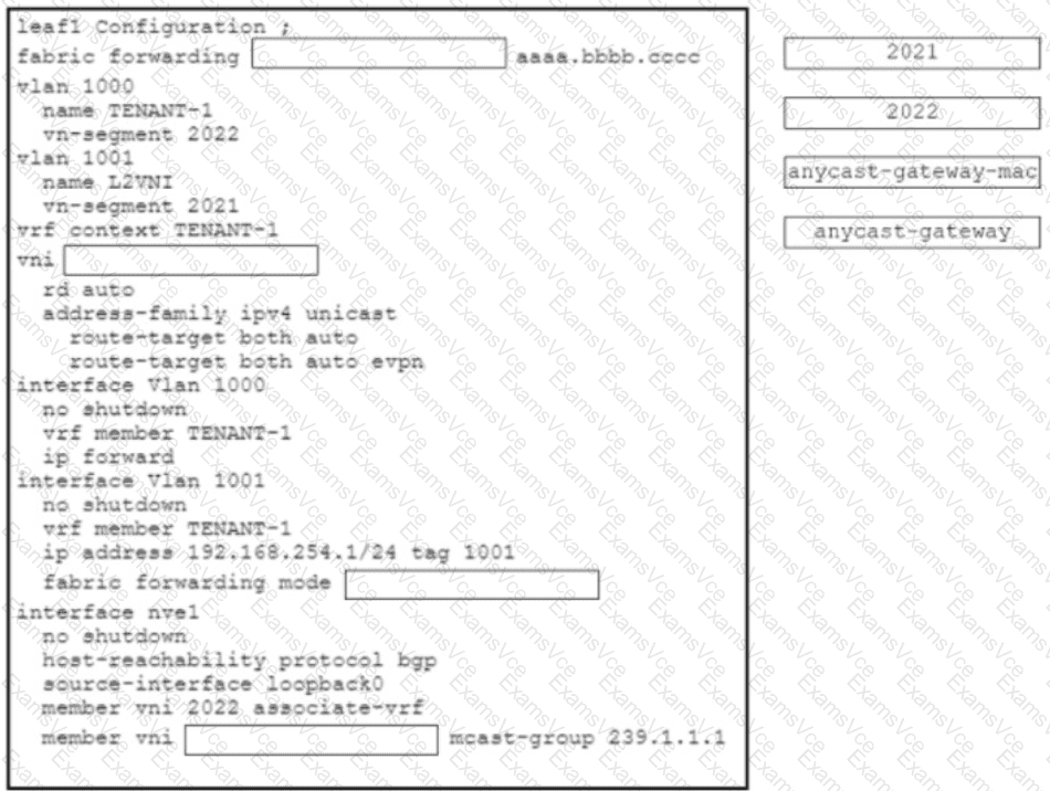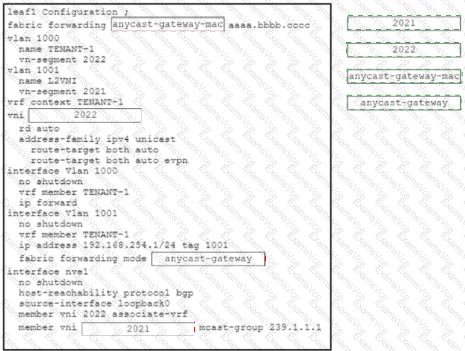 Refer to the exhibit Leaf3 is configured using distributed anycast gateway for the server connected using VLAN 2021 Drag and drop the configuration commands from the right onto the boxes in the code to deploy the distributed anycast gateway on Leaf 1 .