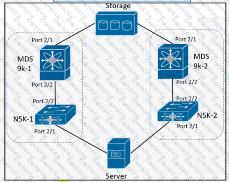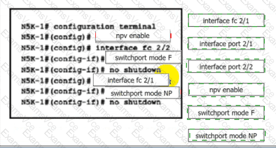 The server is sending traffic to the storage server using Fiber Channel protocol. The requirement is for the N5K-1 to forward traffic to MDS9k-1. Drag and drop the configuration steps from the right to complete the configuration for N5K-1 on the left. Not all configuration steps are used.
