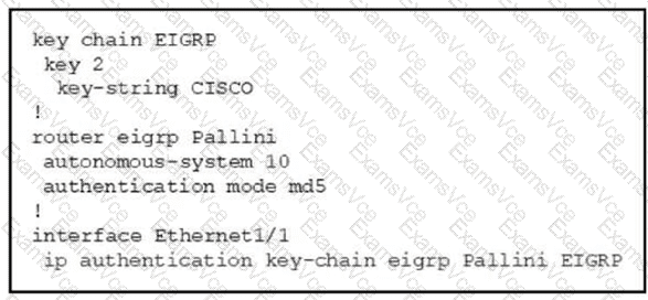 Two Cisco Nexus Series Switches use EIGRP between their Eth1/1 interfaces. The switches are configured to support EIGRP authentication. Which set of CLI