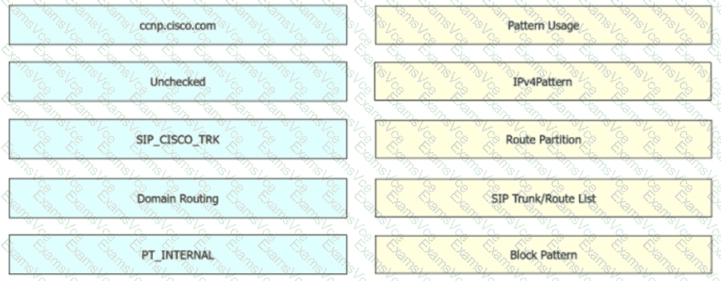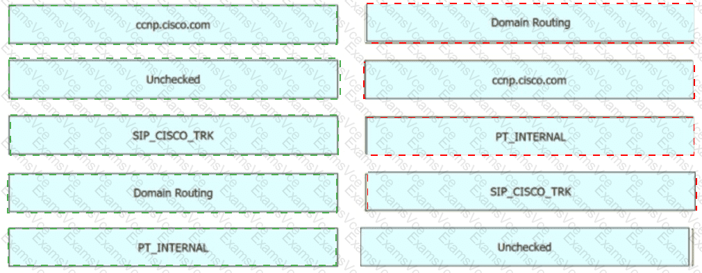 In Cisco UCM, an engineer must create a new SIP route pattern to allow ccnp.cisco com for all internal callers The internal callers have a calling search space named CSSJNTERNAL that includes the partition named PTJNTERNAL If allowed, the calls must be routed to a SIP trunk named SIP_CISCO_TRK. Drag and drop the values from the left onto the corresponding fields on the right.