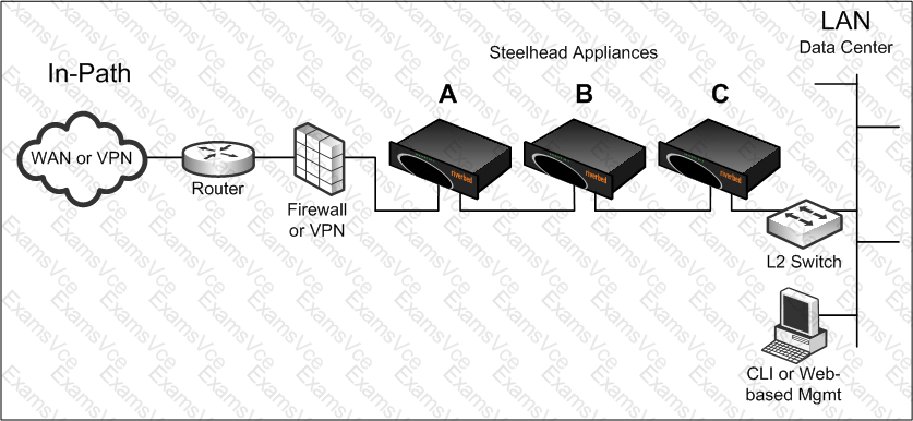 The exhibit shows a data center side serial clustering deployment. In this organization, not every remote site has a Steelhead appliance deployed, and all remote locations will be connecting to the data center.