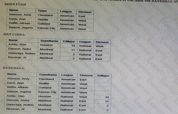 Given the data sets AMERICIAN NATIONAL and results in the data set BASEBALL shown below: