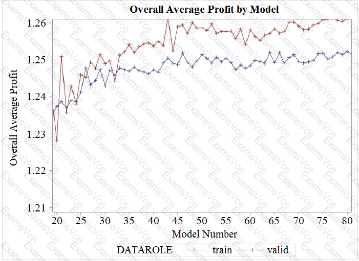 The PROC LOGISTIC options SELECTION=SCORE and BEST=2 are used in a MODEL statement to generate a series of predictive models. The models are assigned numbers in order from 1 to 99 reflecting the fact that there are 50 candidate input variables. Results from the collection of derived models are used to generate the following plot of overall average profit by model number. Results are restricted to models with at least 9 inputs and at most 40 inputs.